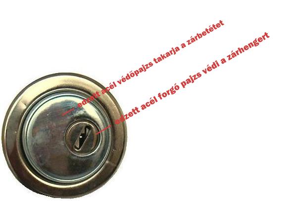 zártípus ugyanis semmi hasonló robosztus külső védelemmel nem rendelkezik. A pajzs külső része edzett acéllemez, a cilinderzár betétet a kulcsnyílásnál hasonló, elforgó edzett acéllemez burkolja. A lemez a normál HSS fúrószáréval azonos keménységű, felfúrni már csak ezért sem kellemes kis sétagalopp, továbbá a körbe forgó belső acél pajzs is nehezíti a zár roncsolását.