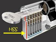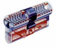 Bal felől látható egy svájci KESO zárbetét metszeti rajza. Az egyik a legnevesebb, és valóban legjobb minőségű cilinderzár ami a piacon beszerezhető. A hagyományos rézházas betétekkel szemben ez sokkal tovább ellenáll a feszítésnek és csavarásnak, köszönhetően a zárház teljes hosszában végigfutó (a képen piros színnel kiemelt) krómnikkel hídnak. Sidra-metal ötvözet háza ugyancsak rendkívül kemény, kiegészítő fúrásvédelemmel van ellátva. Elhajlítása nagyobb erőkifejtést igényel. Feszítés hatására is inkább hajlik mint törik, vagyis kitartó kézimunkával lehet csak kettétörni. A saját magunk által végzett törési kísérlet eredményét is láthatja ha a kurzort a kép fölé mozgatja. A betét hosszan ellenállt a tekergetésnek, jóval több ideig bírta mint egy egyszerű réz cilinder.